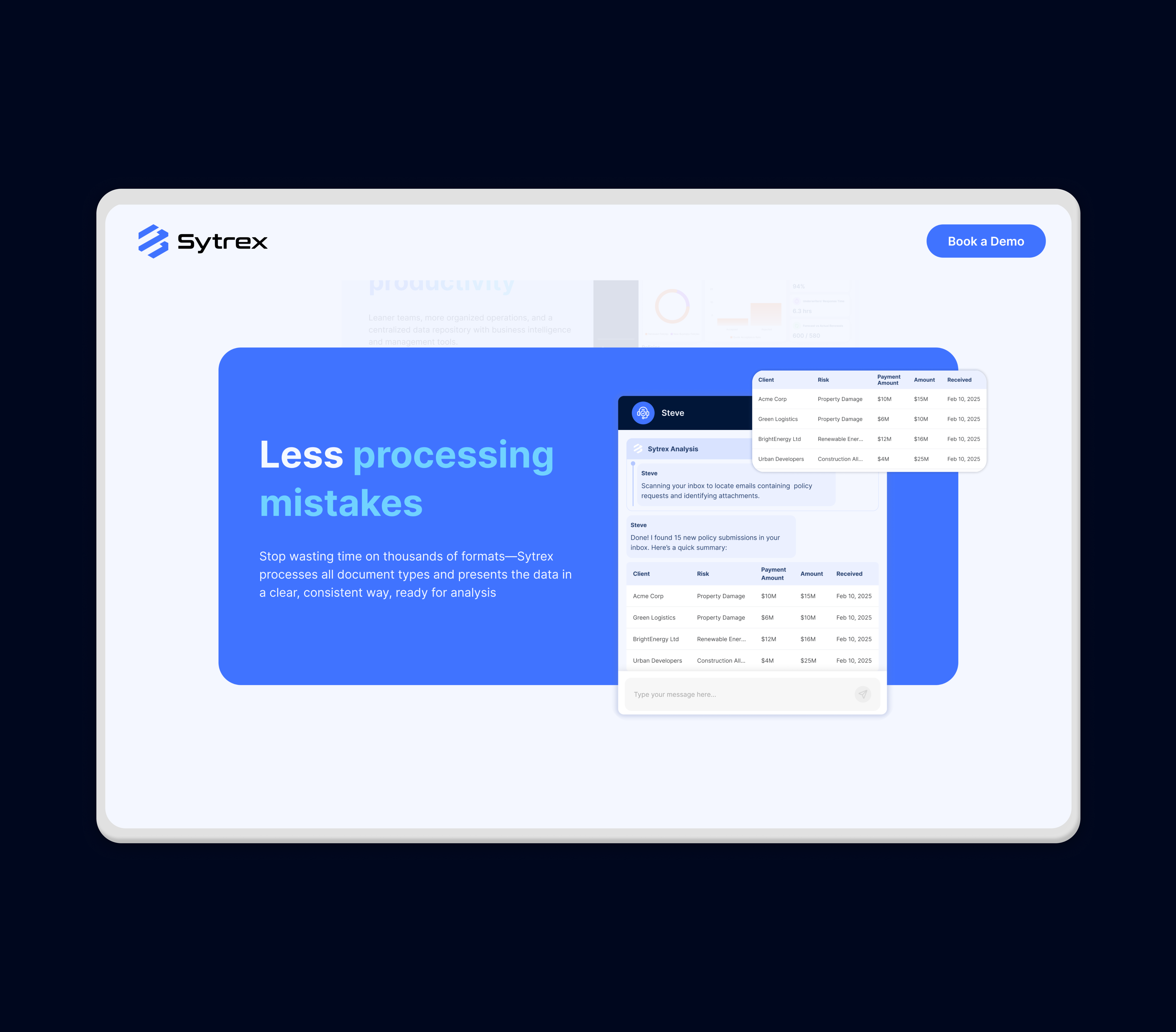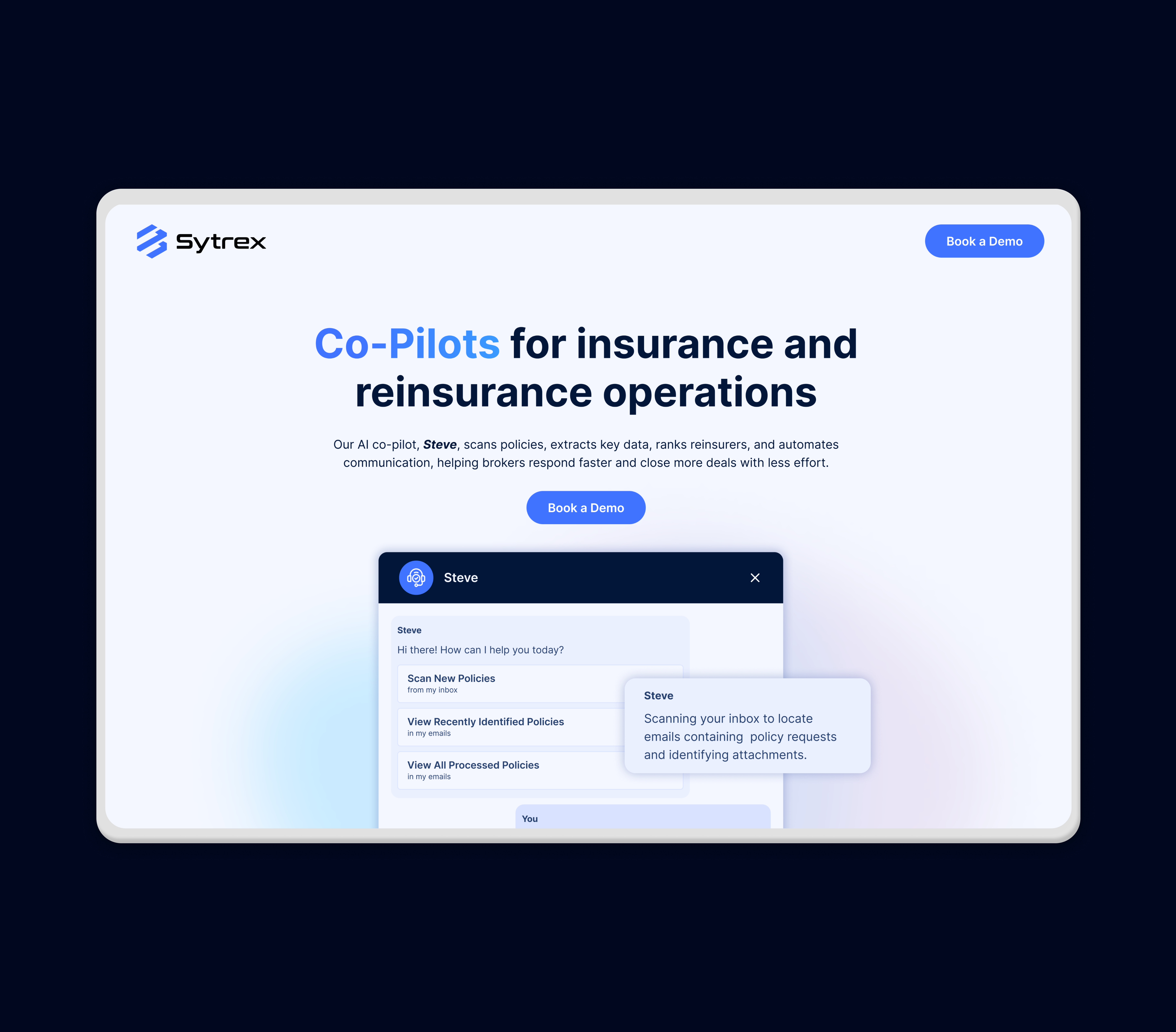 We built Steve - an AI Co-Pilot for insurance and reinsurance- from the ground up with a user-first approach, streamlining policy scanning, data extraction, and reinsurer ranking into one intuitive platform. By simplifying workflows and aligning with business goals, we delivered a smart, automated tool that boosts efficiency, strengthens relationships, and supports growth.